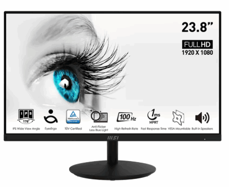 Бизнес Монитор 23.8″ MSI PRO MP242A, IPS, 1920×1080 FHD, 100Hz, 1ms (MPRT) / 4ms (GTG), 1000:1, 300 cd/m2, Угол Обзора