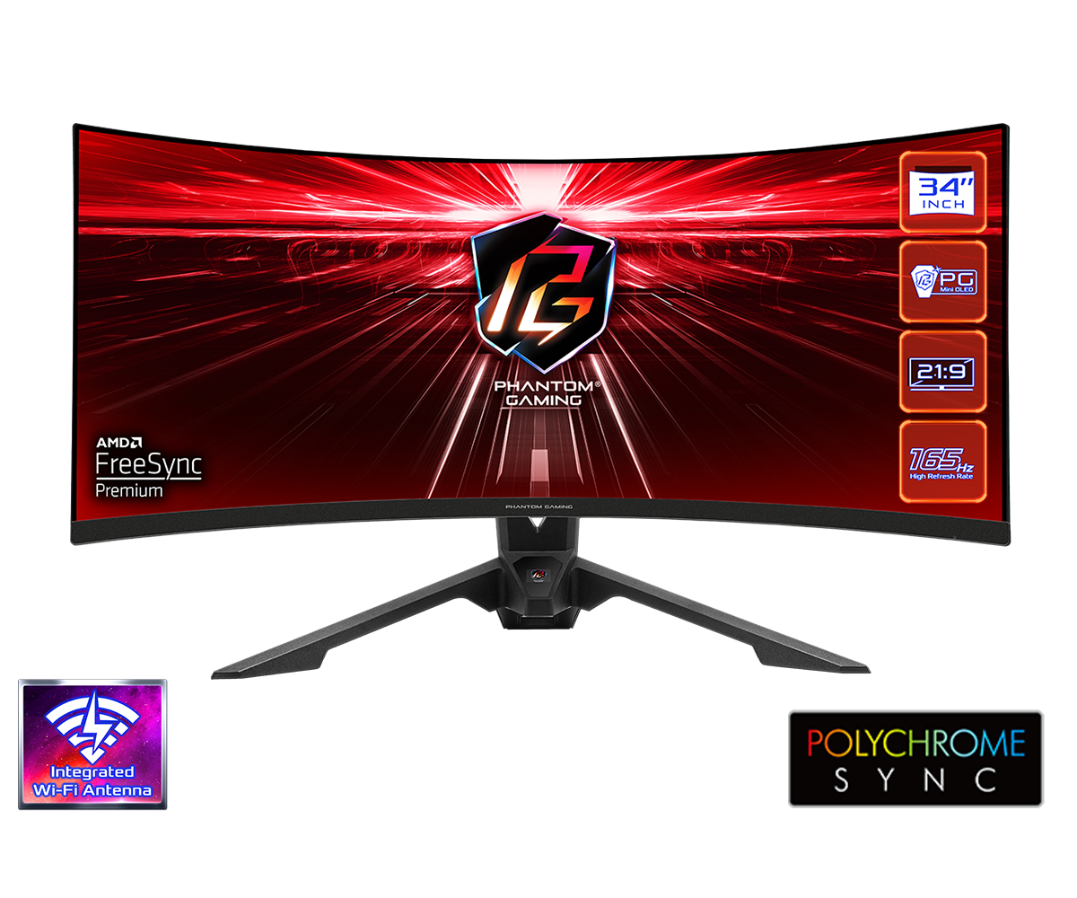 Геймерский Профессиональный Монитор из серии PHANTOM GAIMING 34″ ASRock PG34WQ15R3A VA 3440×1440@165Hz 1мс 550cd/m2 3000:1 Curved 1500R, HDR 400, 2xHDMI DP Встроенные колонки 2Wx2, Регулировка высоты, Встроенная антенна Wi-Fi, Black